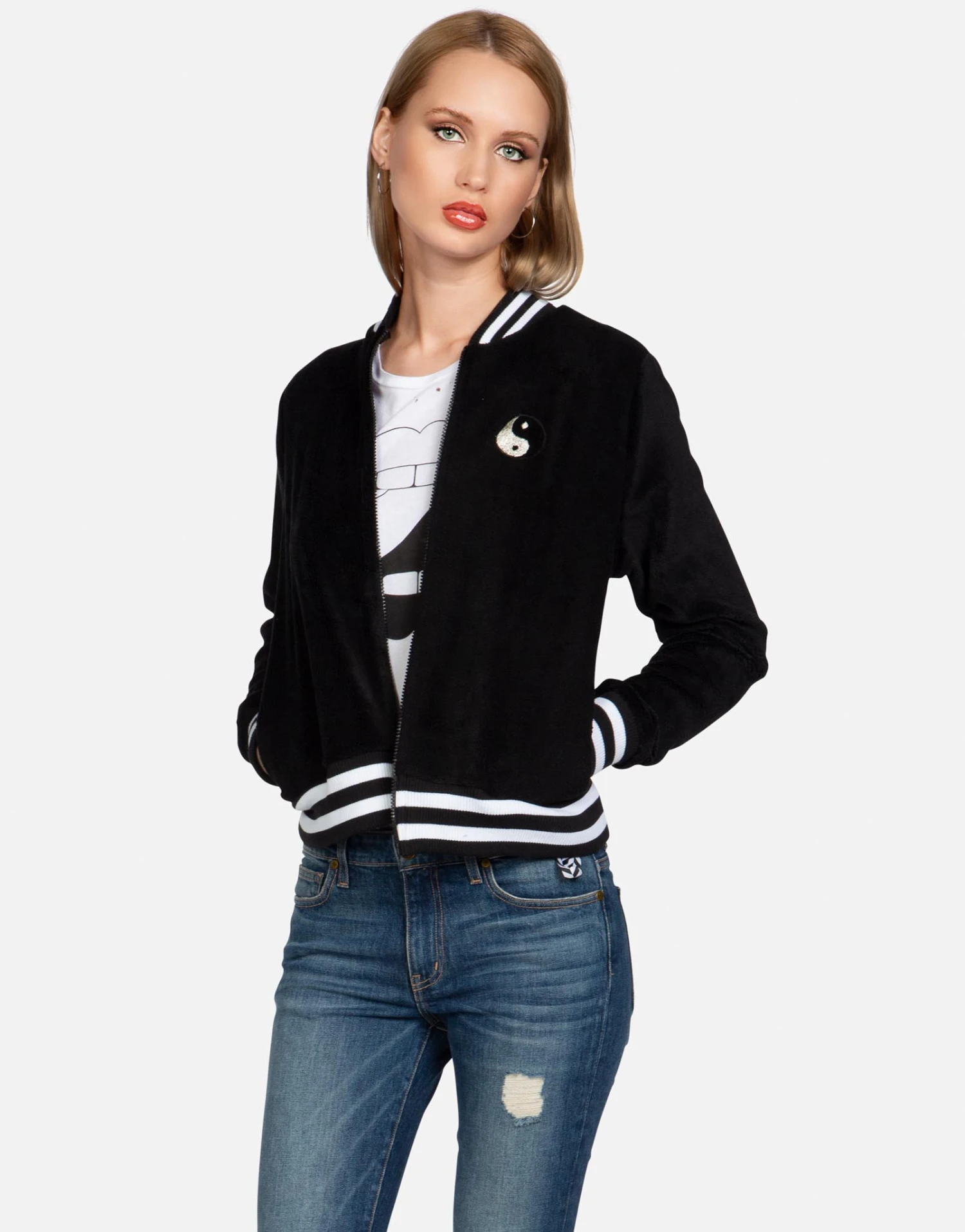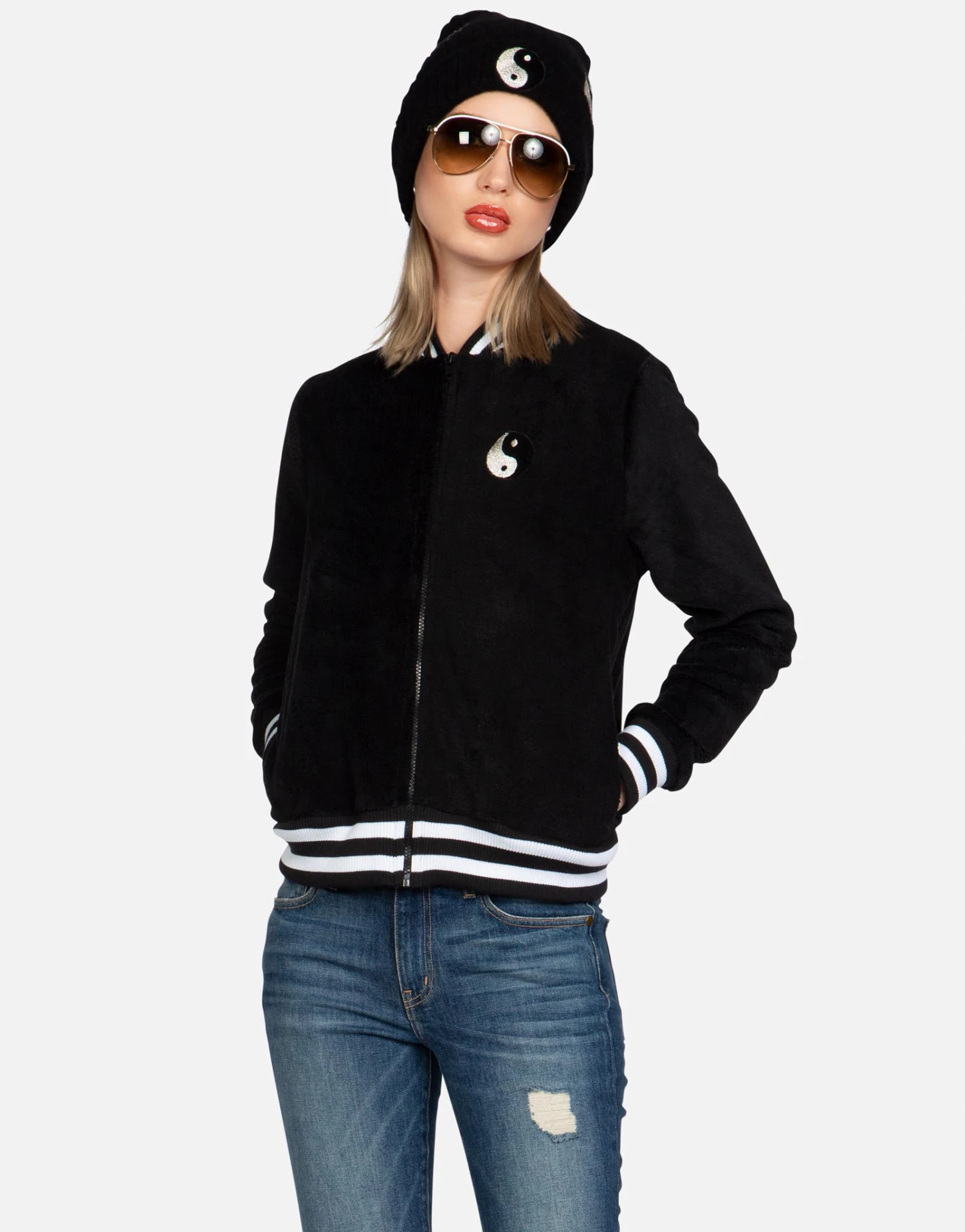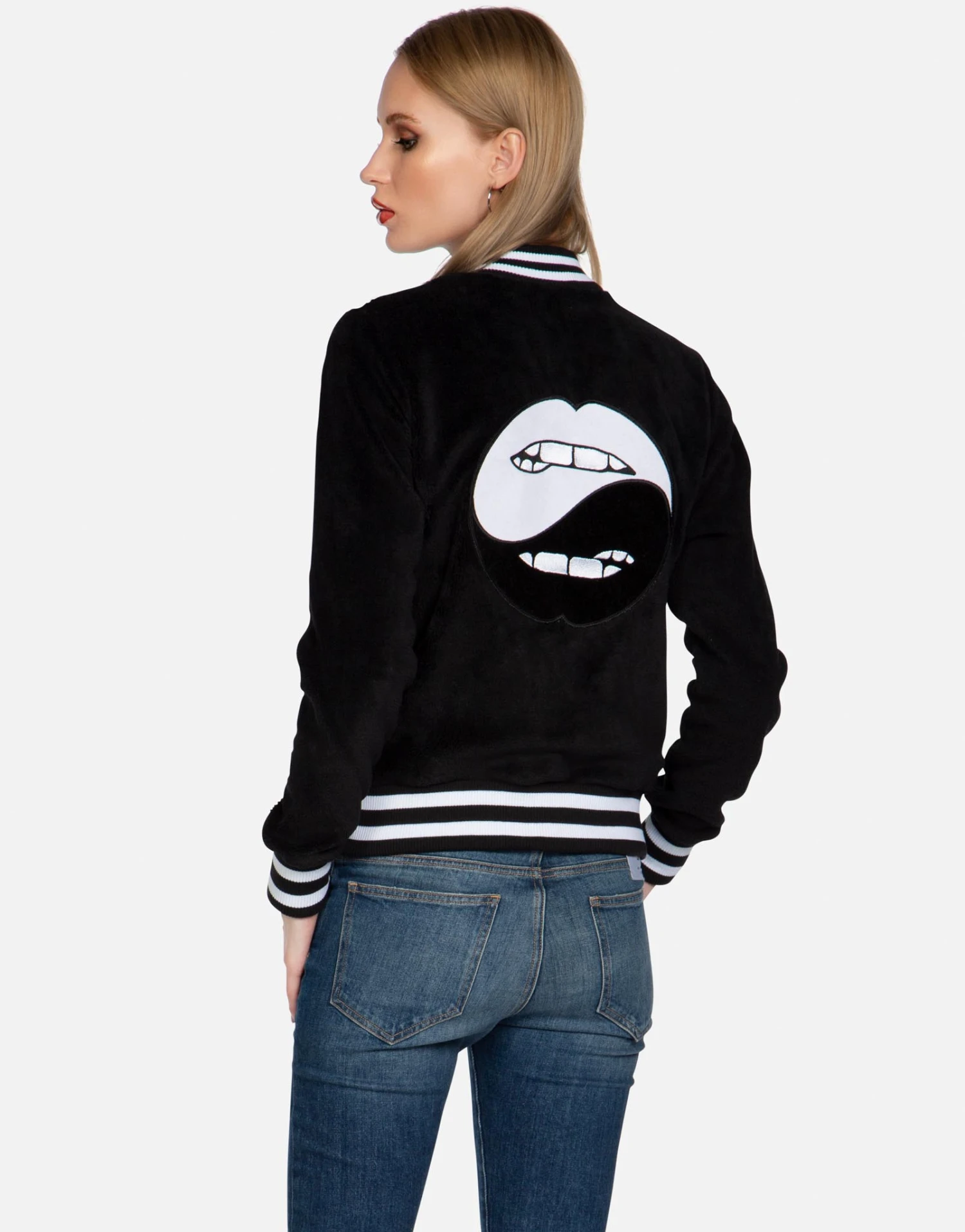 Biting Lip Yin Yang Patches Embroidered on Ultra Soft Faux Fur Jacket in Black by Lauren Moshi.