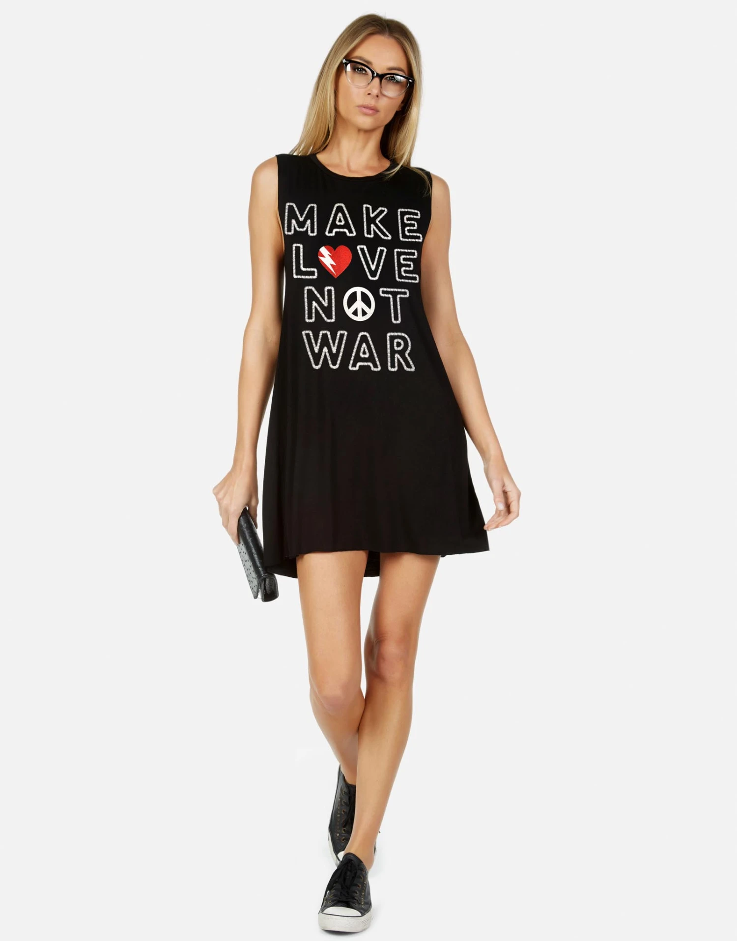 WEB EXCLUSIVE | Make Love Not War Printed on Ultra Soft Lightweight Mini Dress in Onyx by Lauren Moshi.