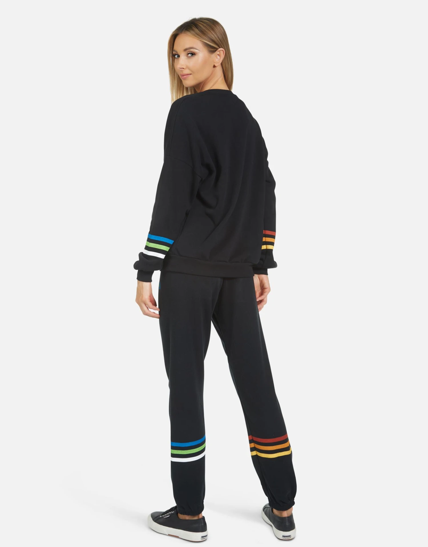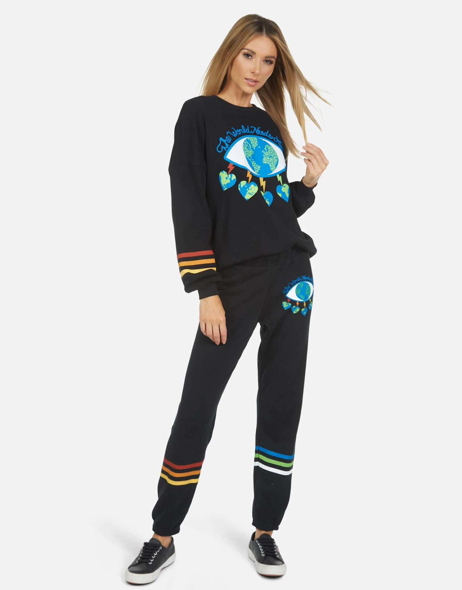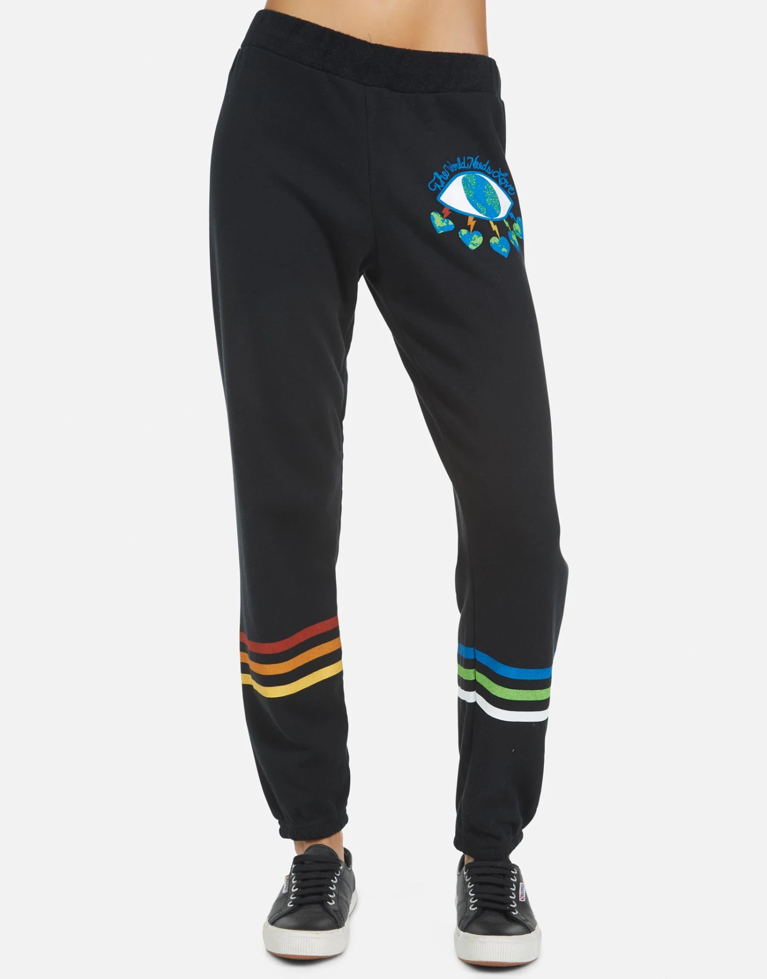 World Eye Love Printed on Ultra Soft Lightweight Sweatpant in Black by Lauren Moshi.
