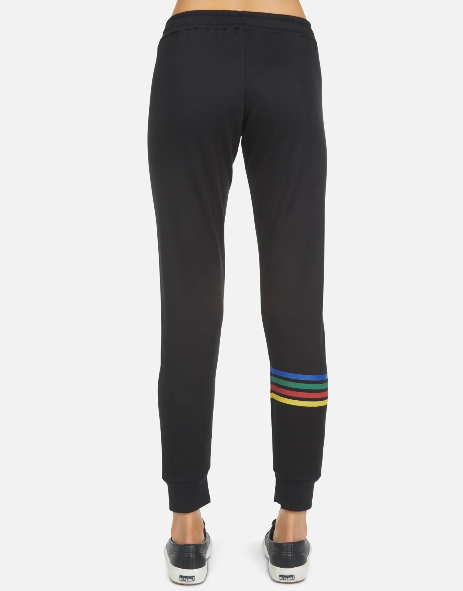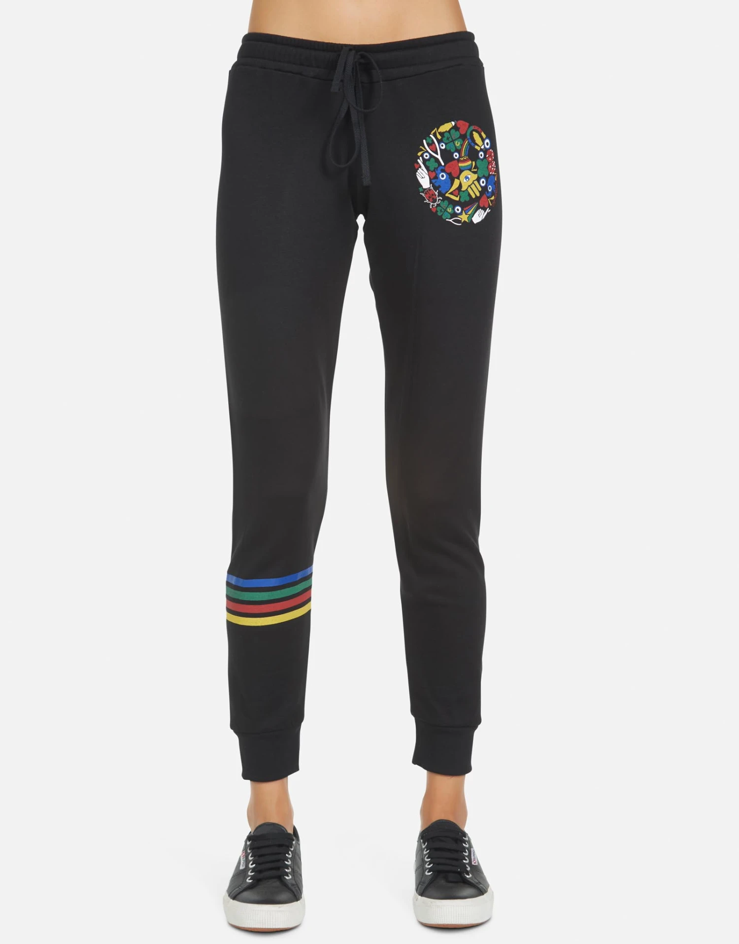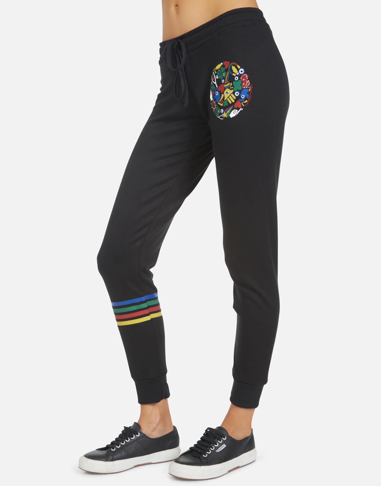 Lucky Happy Face Printed on Ultra Soft Lightweight Sweatpant in Black by Lauren Moshi.
