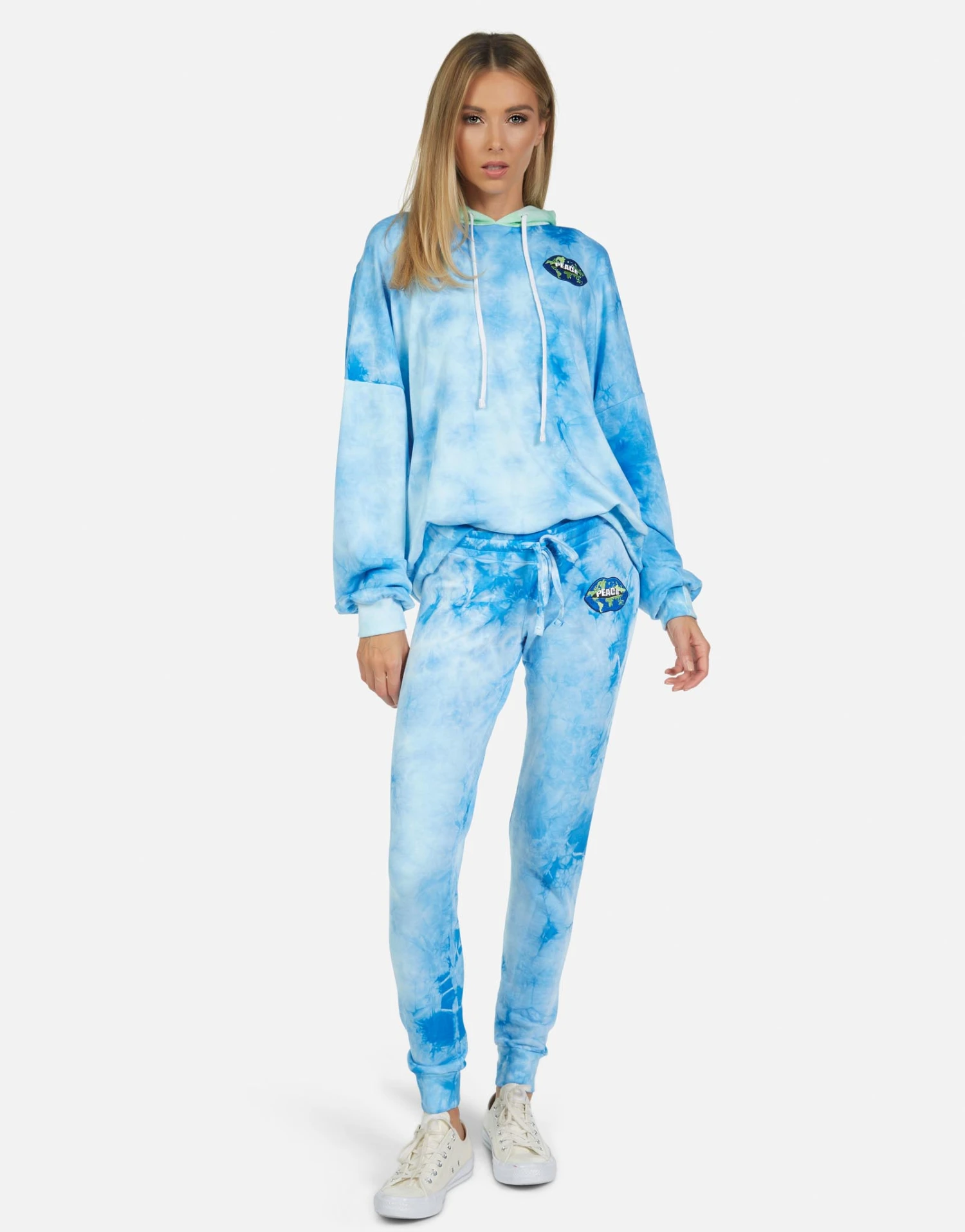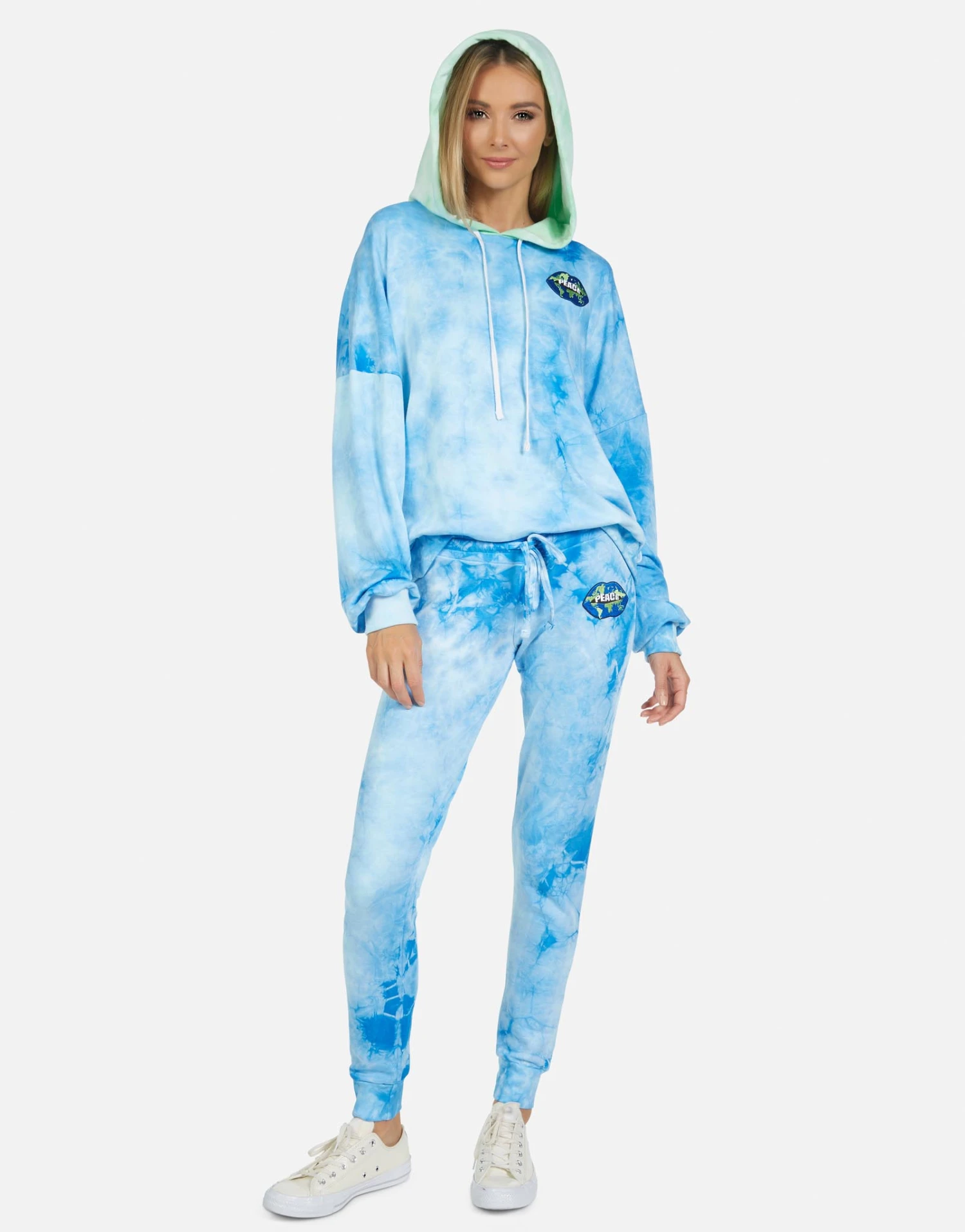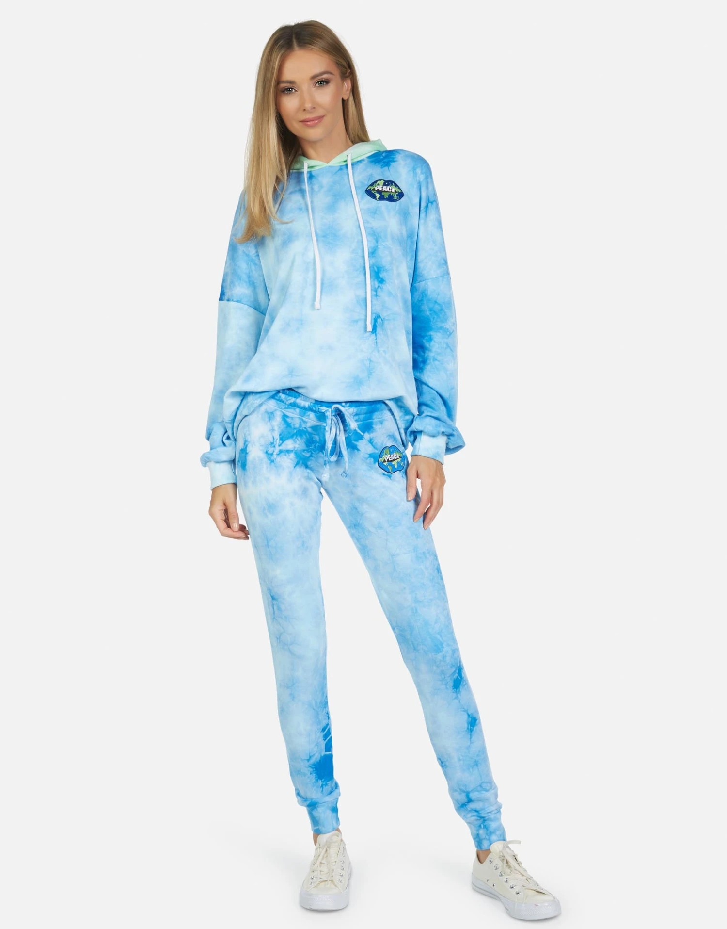 World Peace Lips Printed on Ultra Soft Lightweight Sweatpant in Blue Clouds by Lauren Moshi.