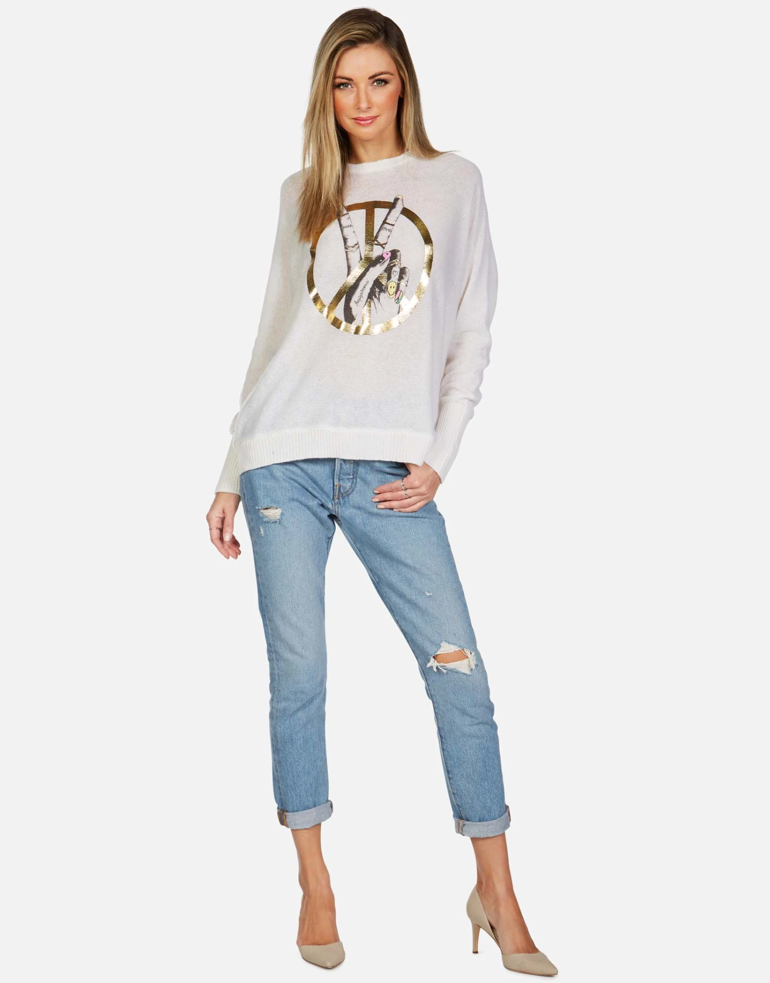 Peace Sign Hand Printed on Ultra Soft Cashmere Sweater in Creme by Lauren Moshi.