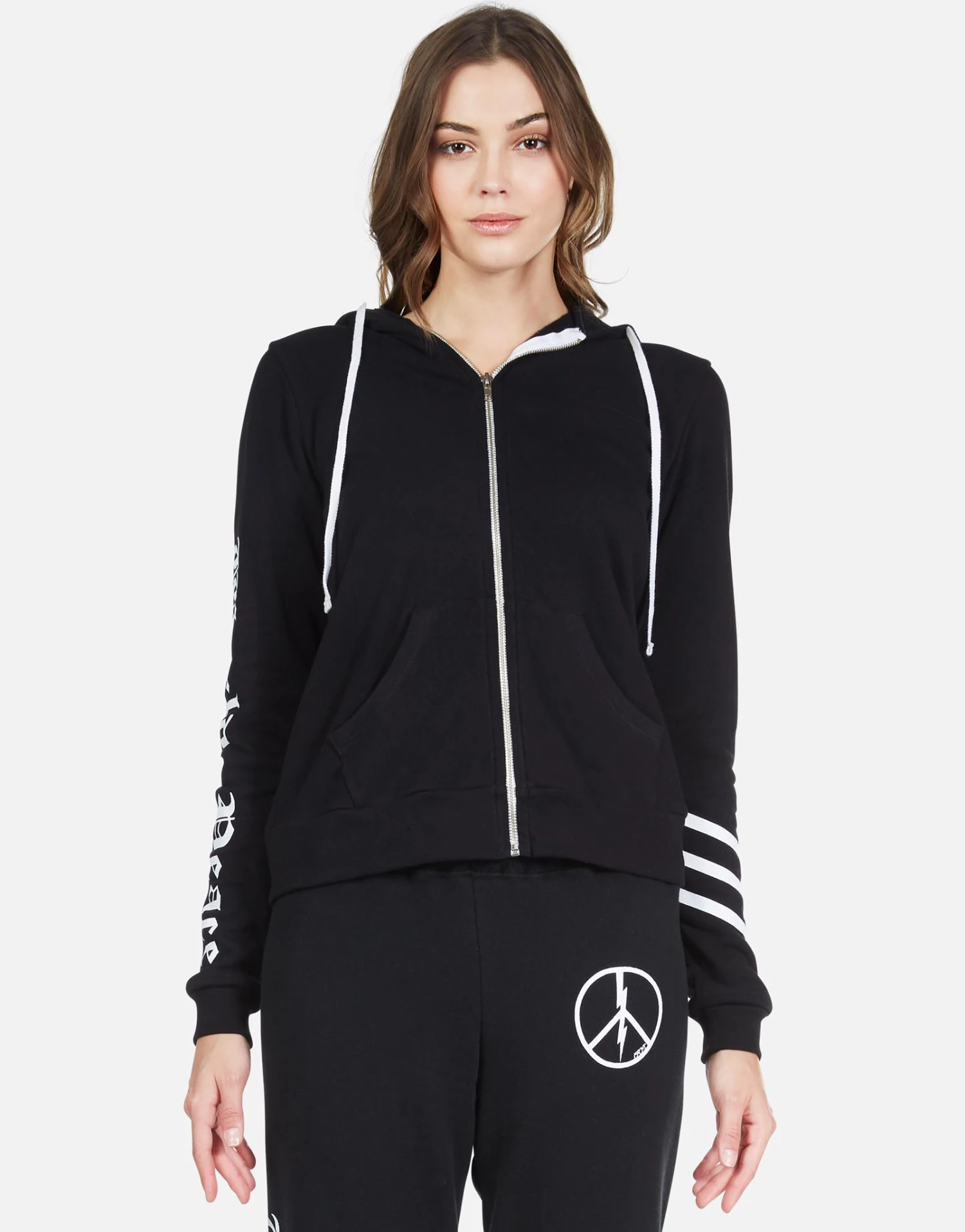 World Peace Printed on Ultra Soft Lightweight Pullover Hoodie in Black by Lauren Moshi.