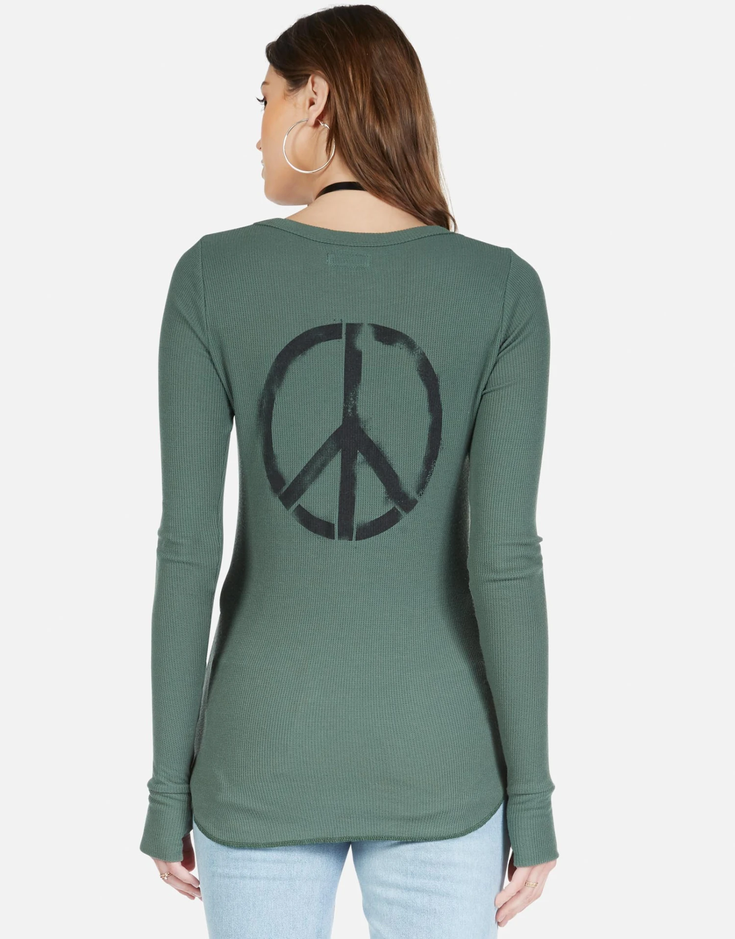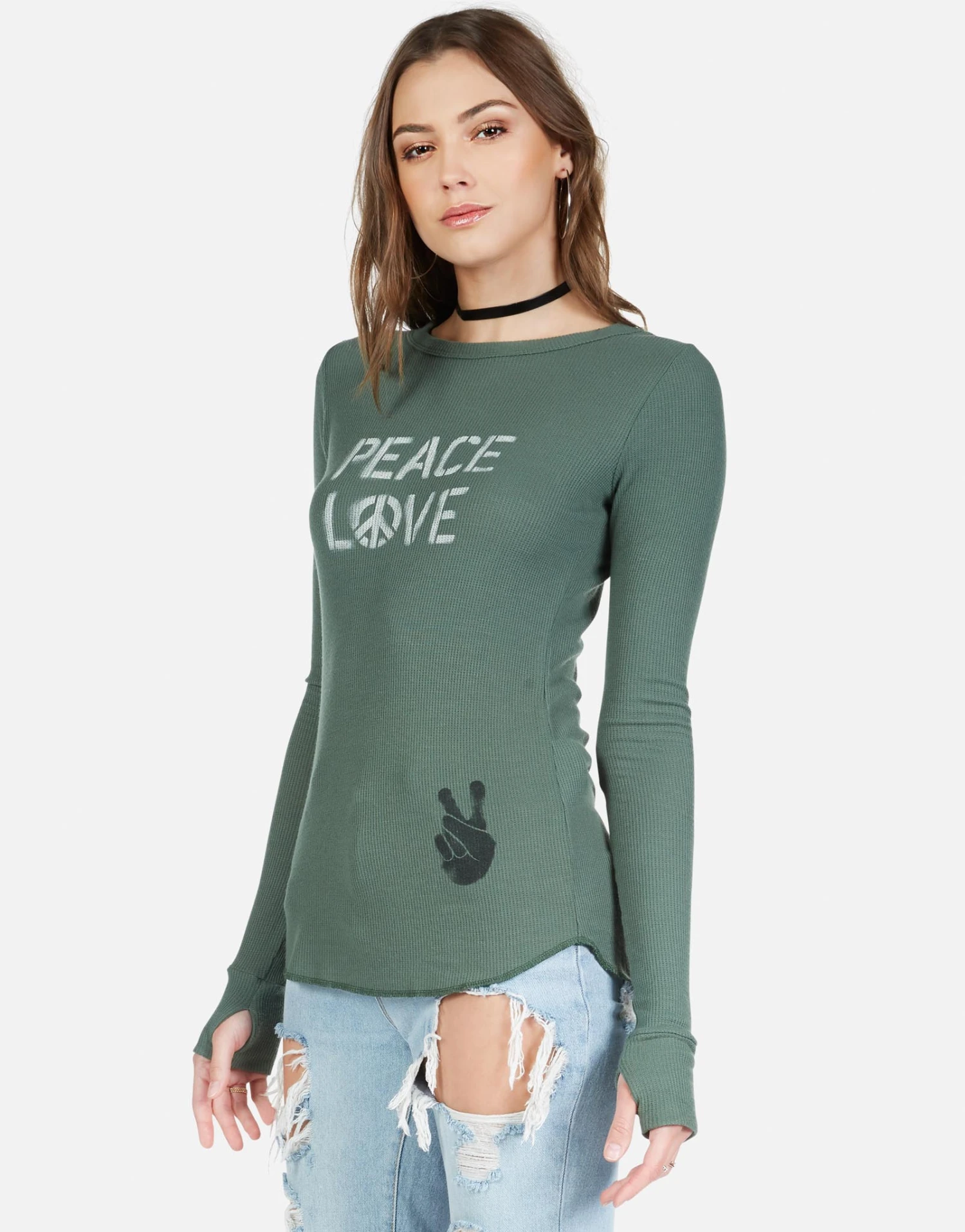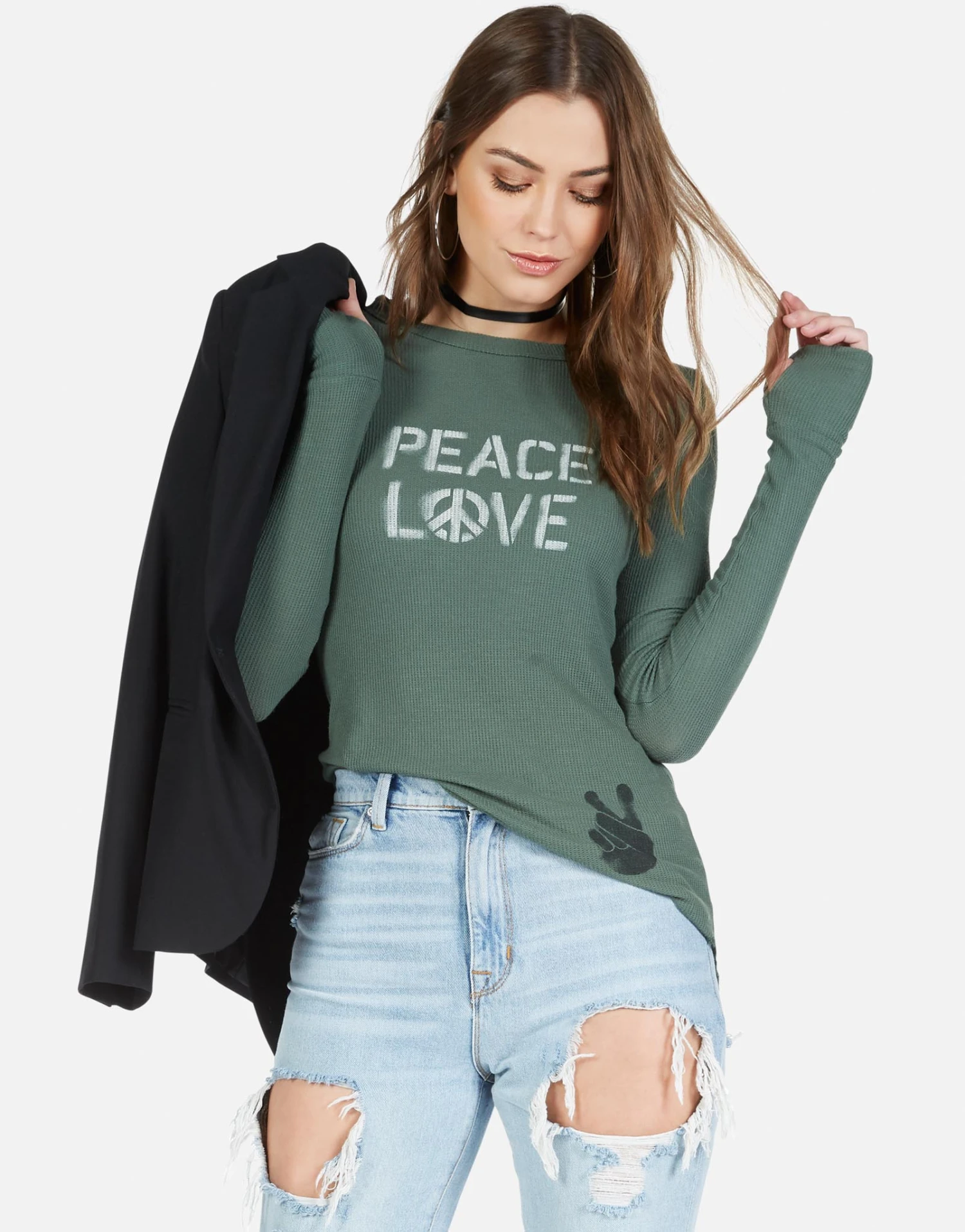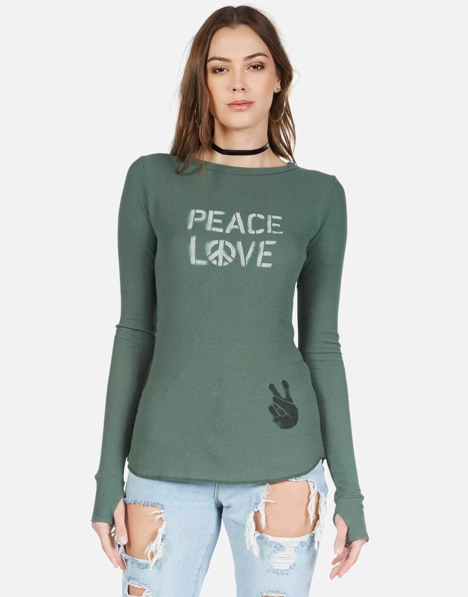 Peace Love Spray Printed on Ultra Soft Lightweight Thermal in Hunter by Lauren Moshi.