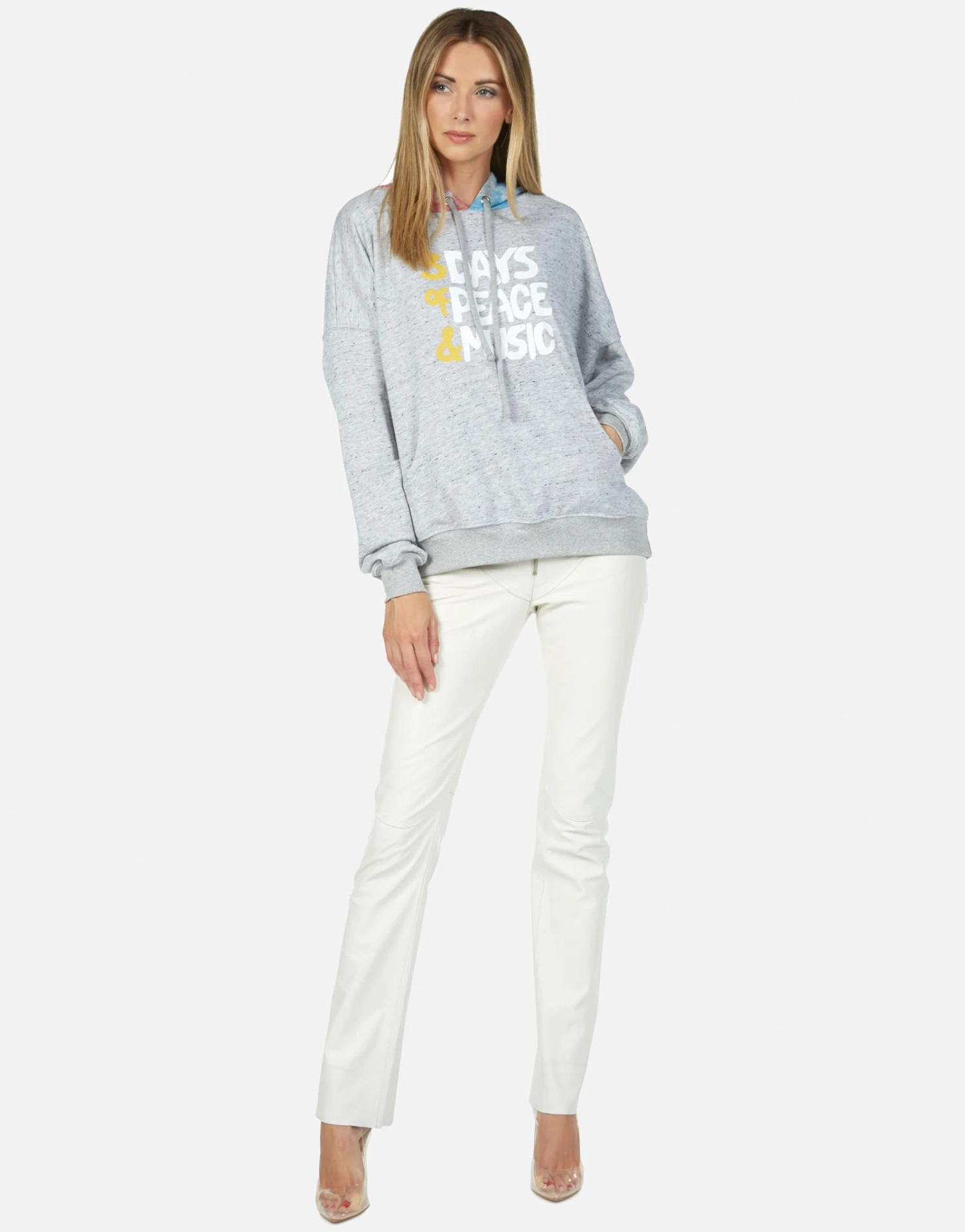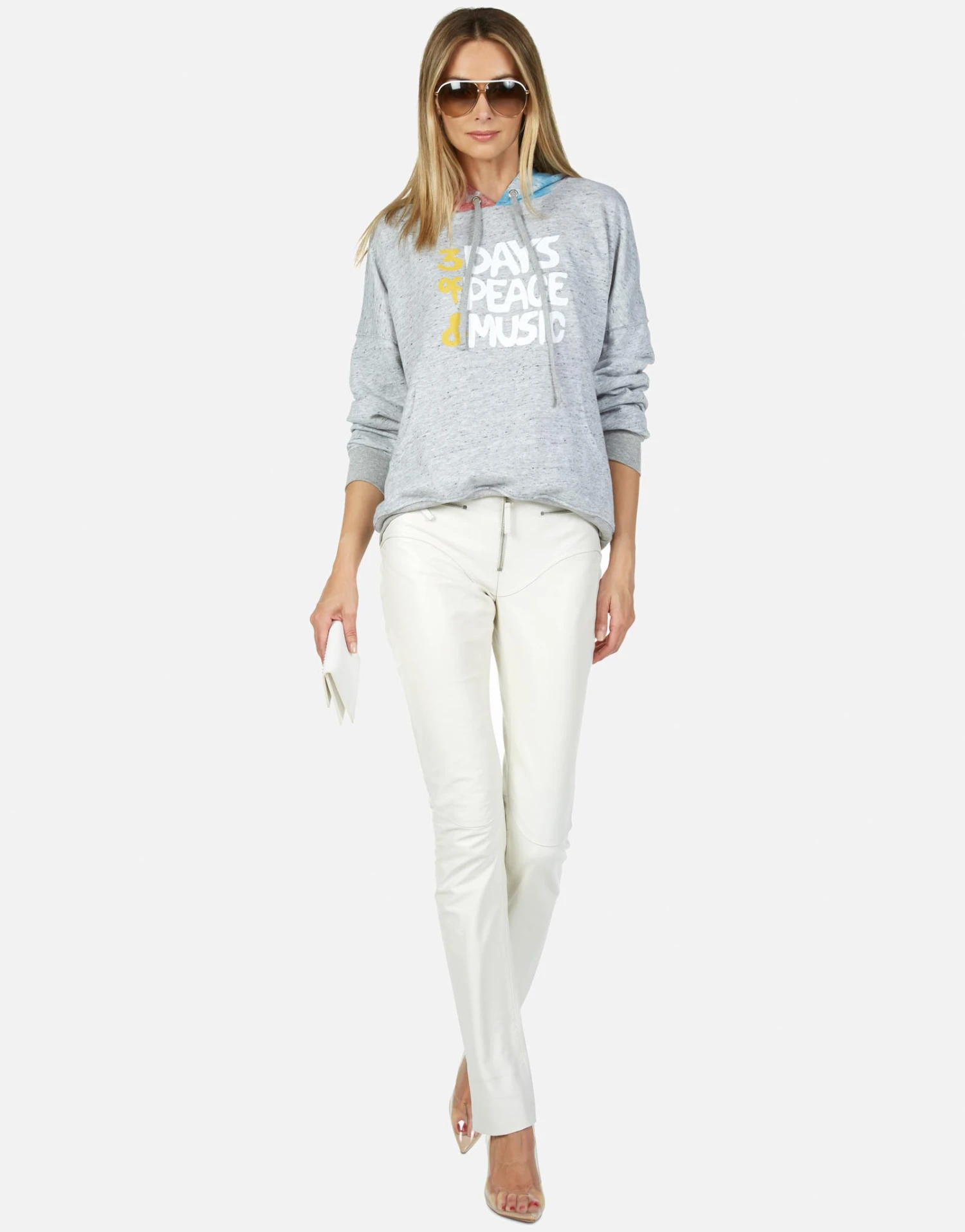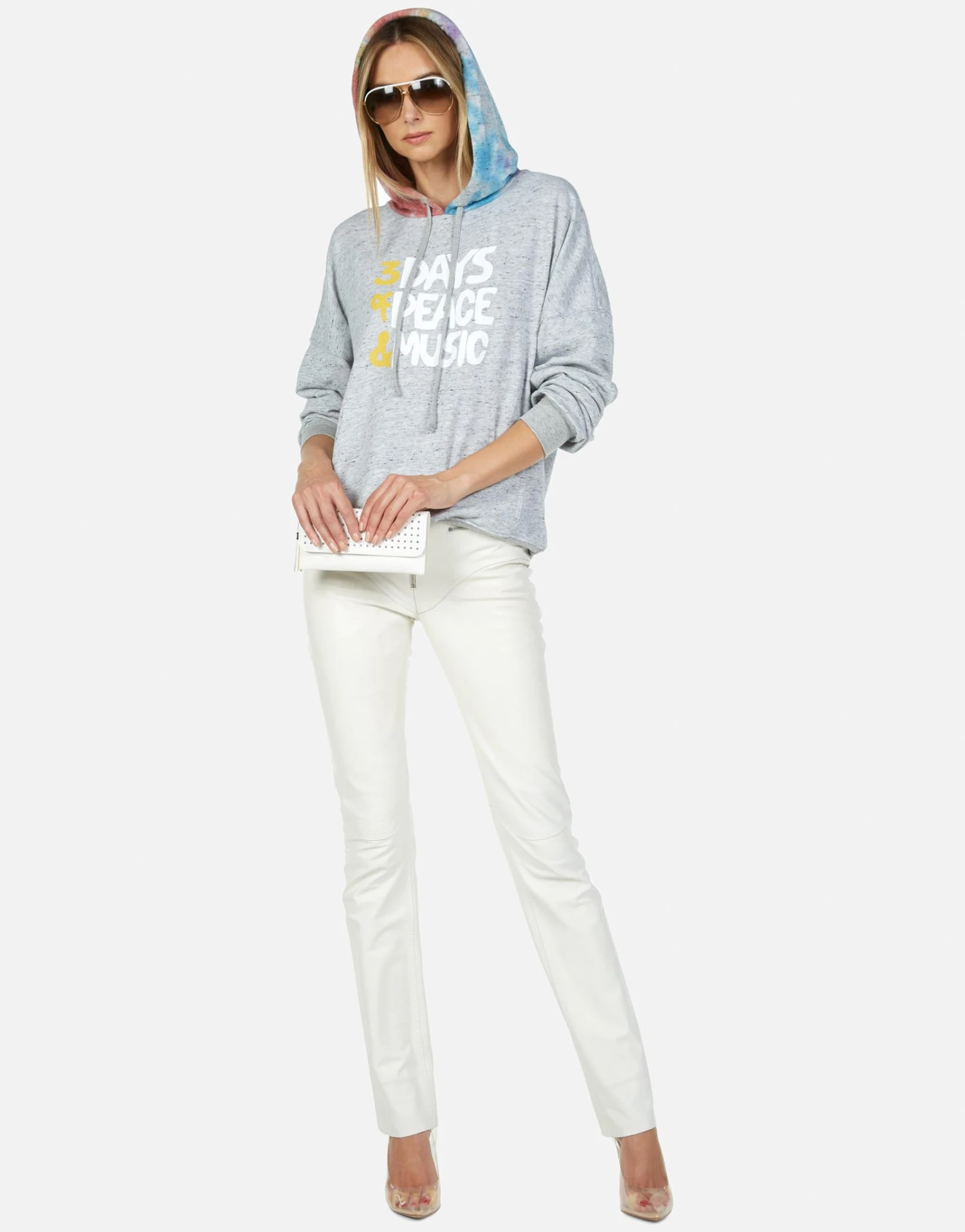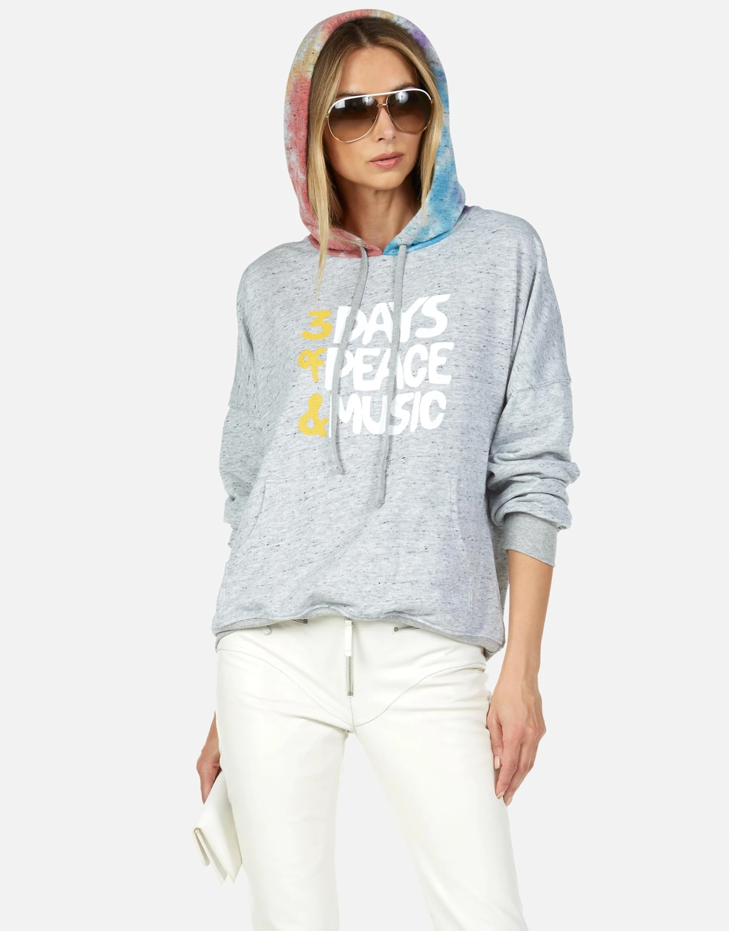 Woodstock Peace Printed on Ultra Soft Lightweight Hoodie in Heather Grey/Skittles by Lauren Moshi.