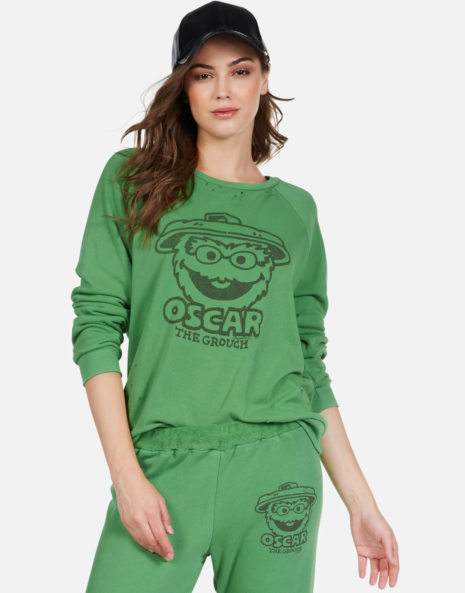 Oscar Grouch of The Year Printed on Ultra Soft Lightweight Pullover in Leaf Green by Lauren Moshi.