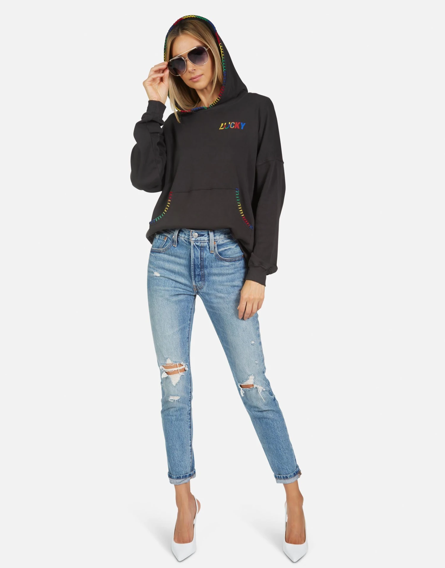 Lucky Happy Face Printed on Ultra Soft Lightweight Hoodie in Onyx by Lauren Moshi.