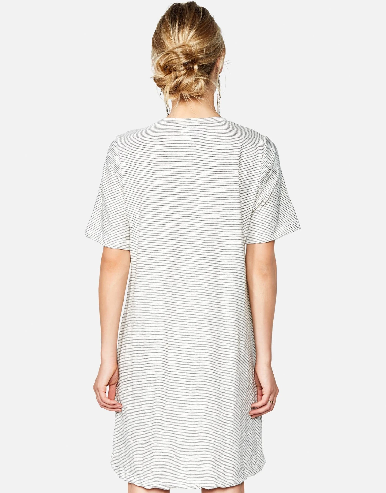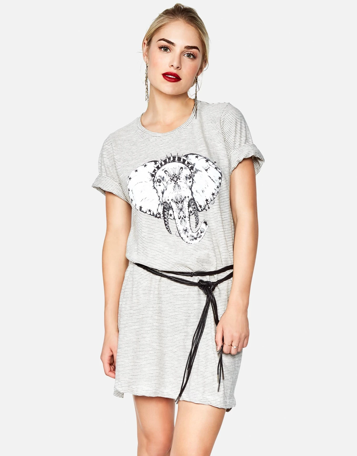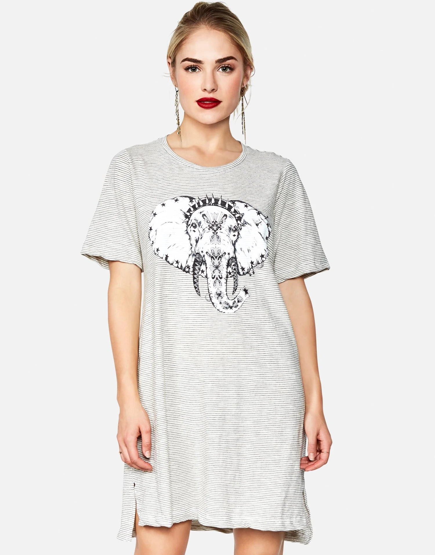 Rocker Elephant on Super Soft Short Sleeve T-Shirt Dress in Charcoal Stripe by Lauren Moshi.