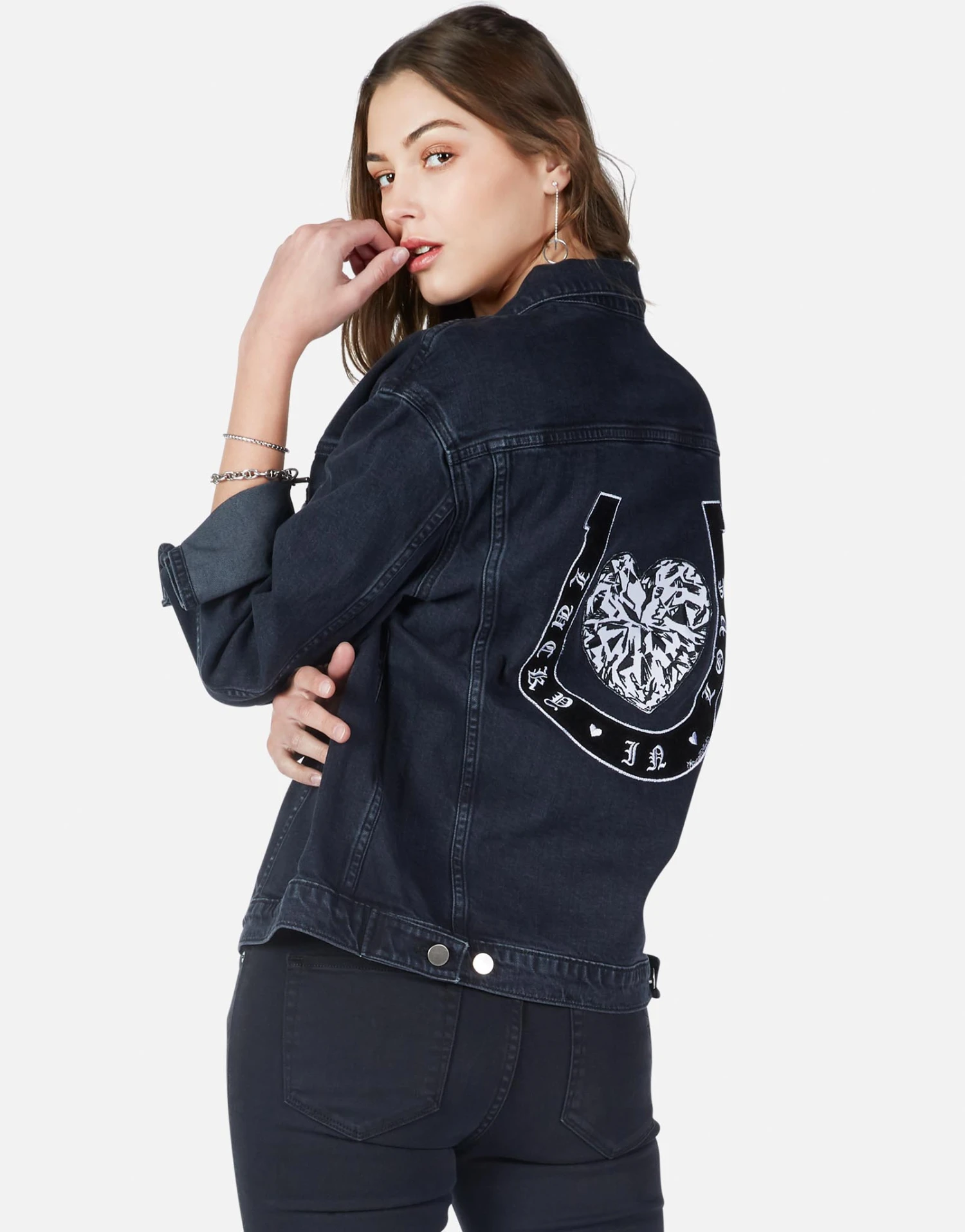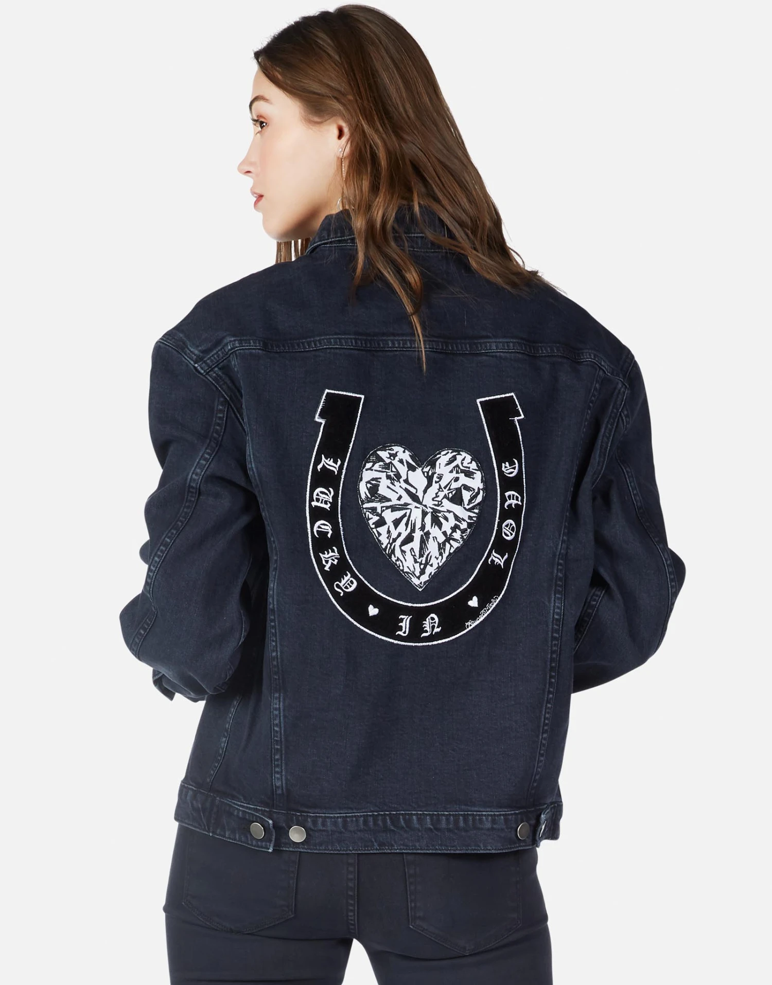 Lucky in Love Patches on Boyfriend Denim Jacket in Vintage Black by Lauren Moshi.