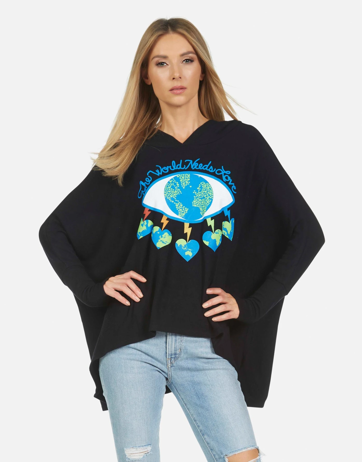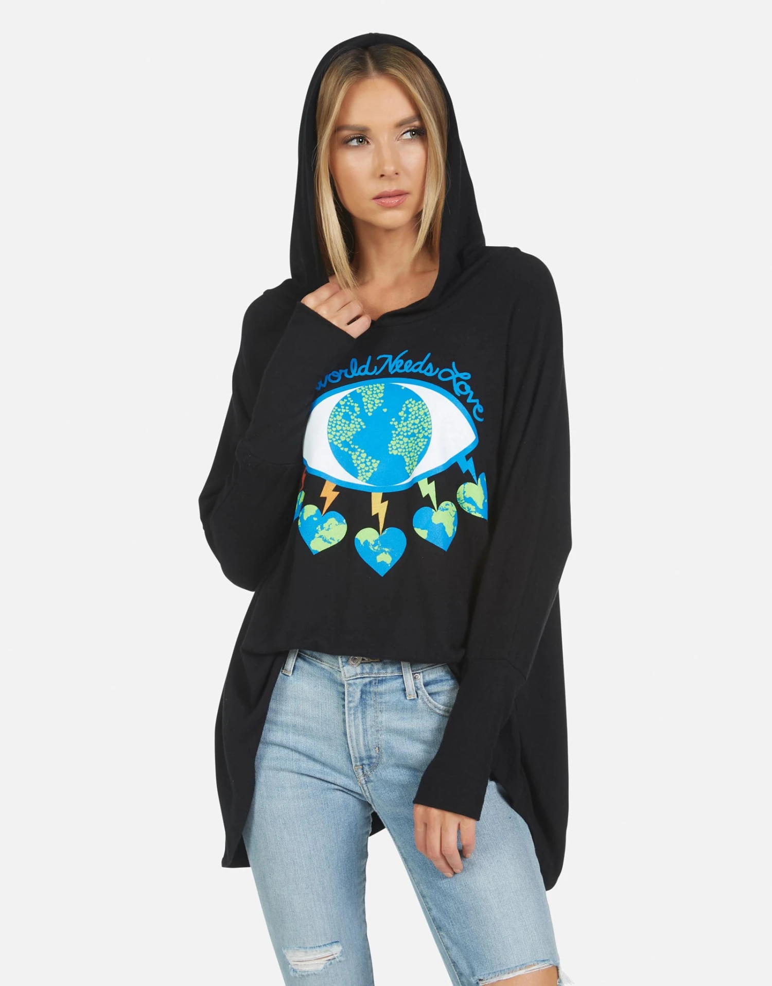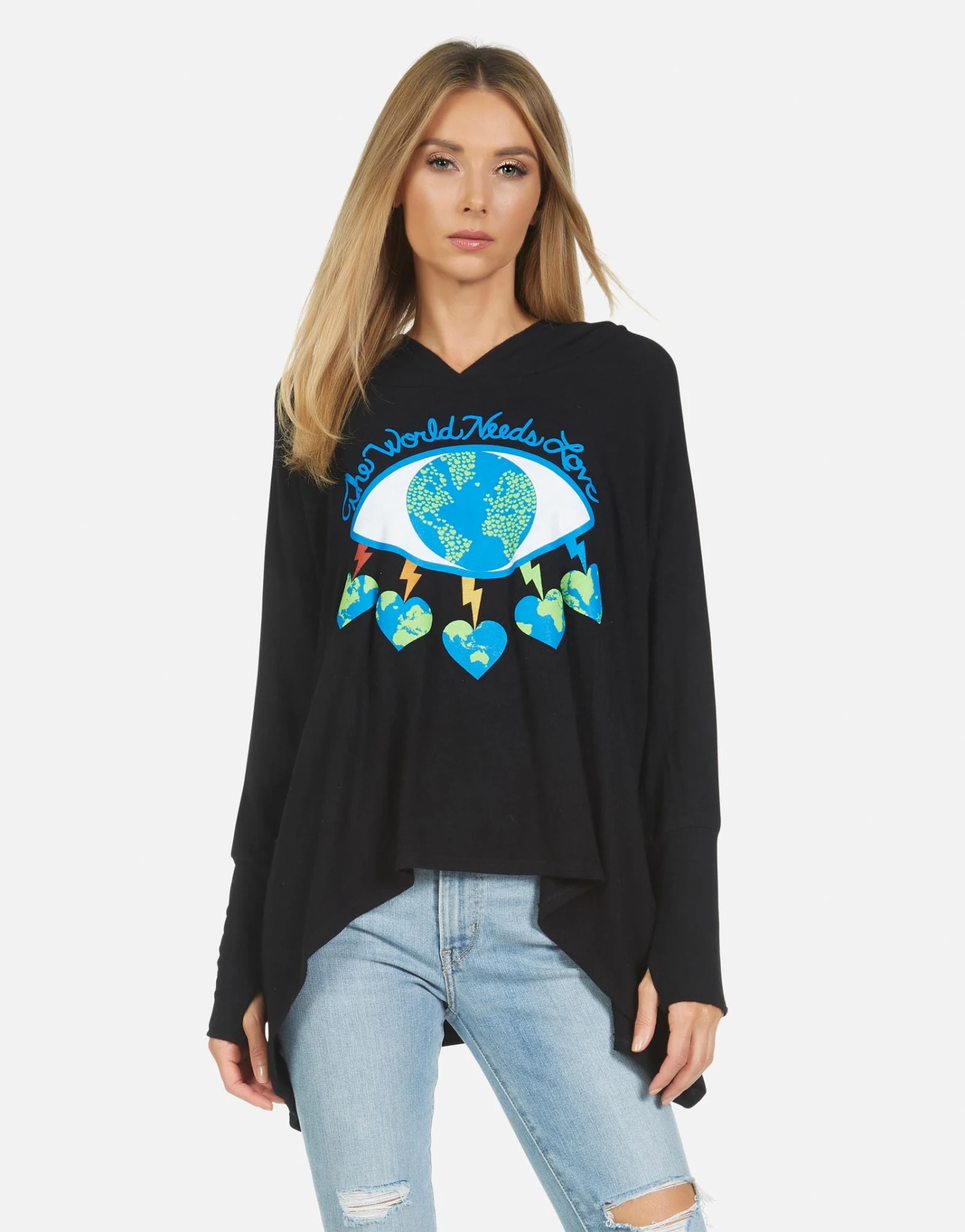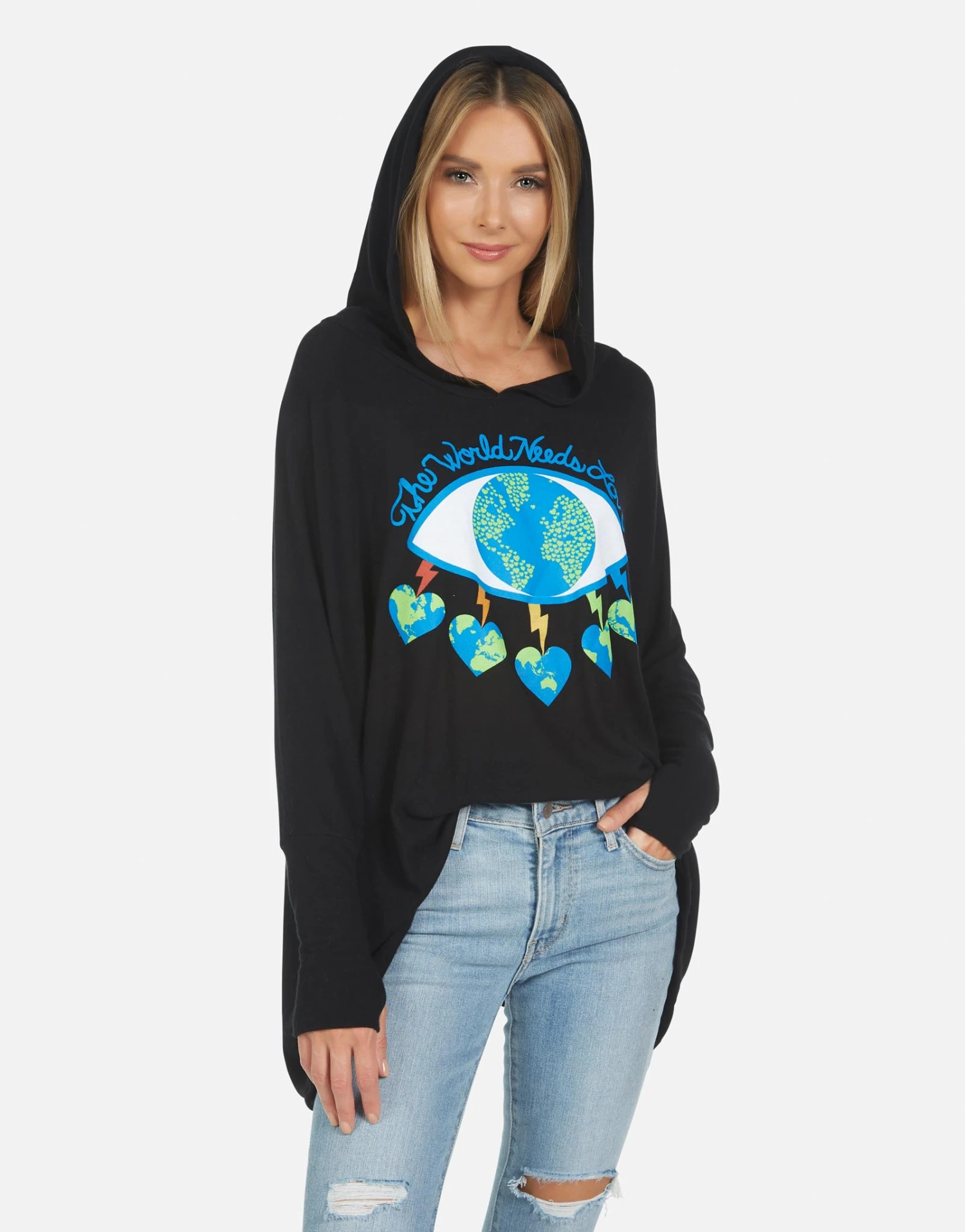 World Eye Love Printed on Ultra Soft Lightweight Hoodie in Black by Lauren Moshi.