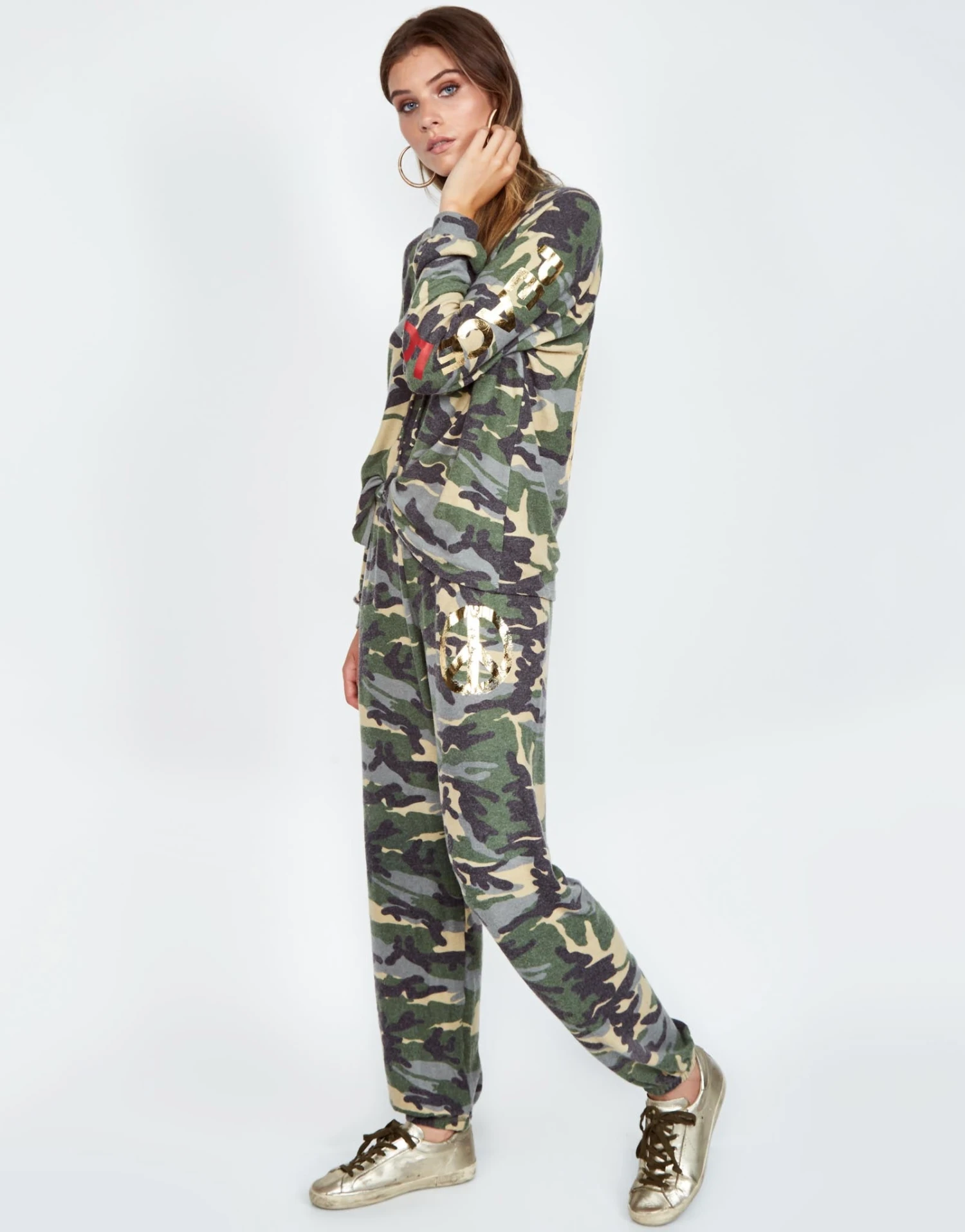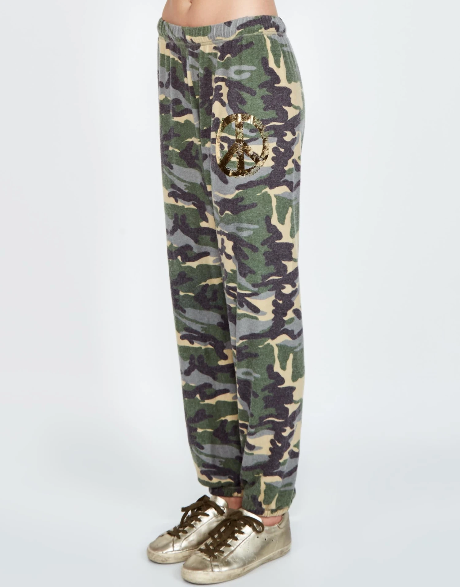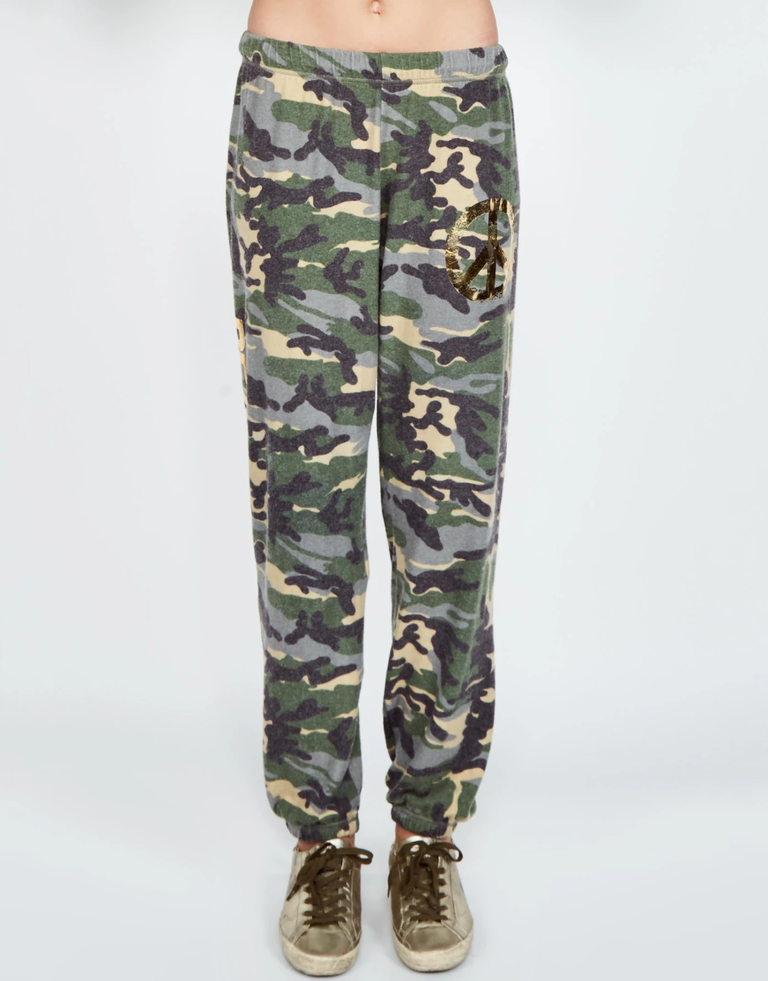 Foil Vintage Peace & Love Printed on Ultra Soft Long Pant in Vintage Camo.